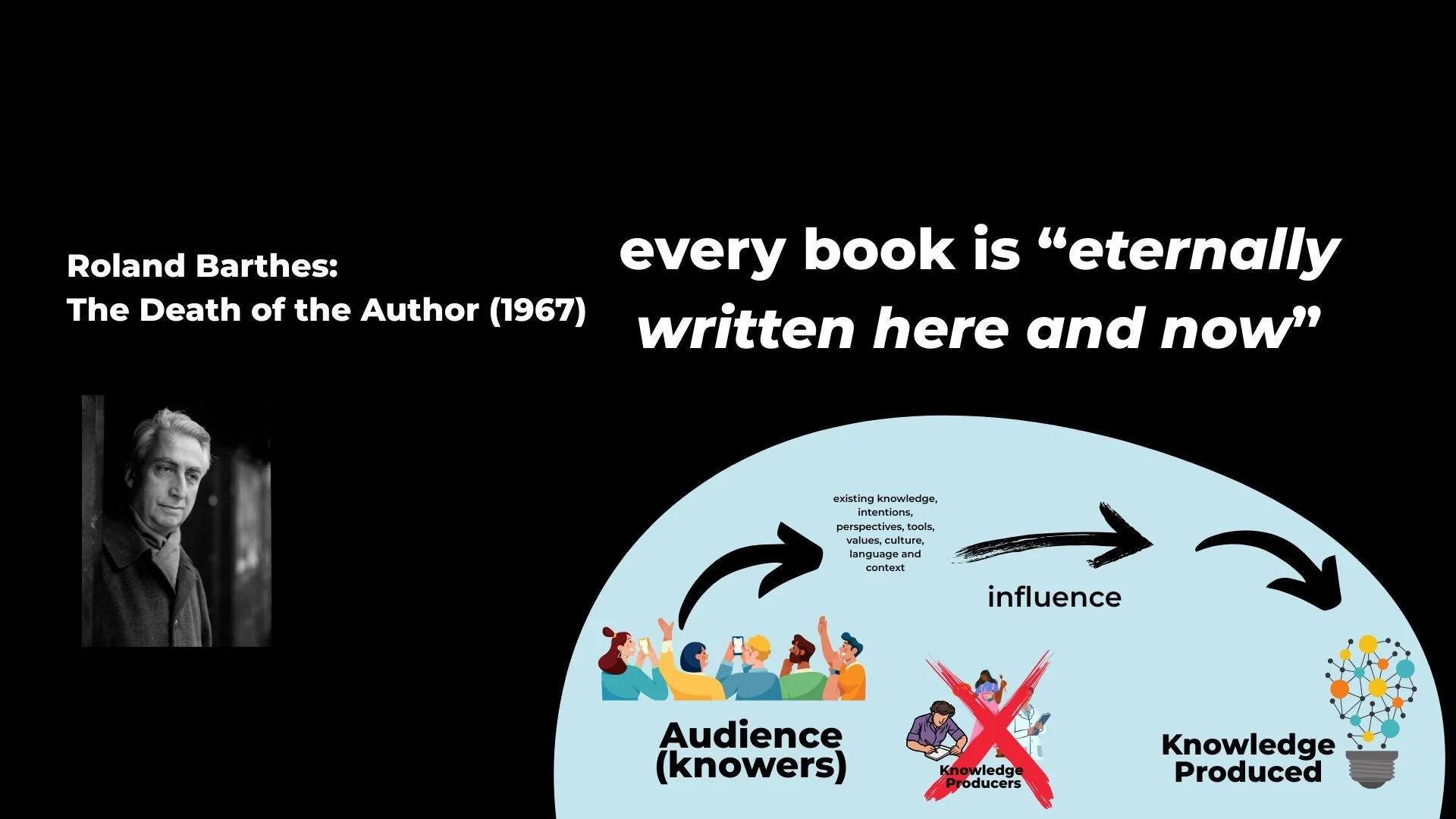 In his influential 1967 essay The Death of the Author, Roland Barthes questioned the assumption that the meaning of a text (or knowledge) is tied to its producer. Barthes proposed that texts gain meaning not from their author but from their readers. The author is merely the scriptor—the person who provides a canvas upon which meaning is endlessly constructed and reconstructed by those who interpret it. As Barthes famously observed, every text is “eternally written here and now,” meaning that knowledge evolves each time it is encountered and reinterpreted by a new knower.